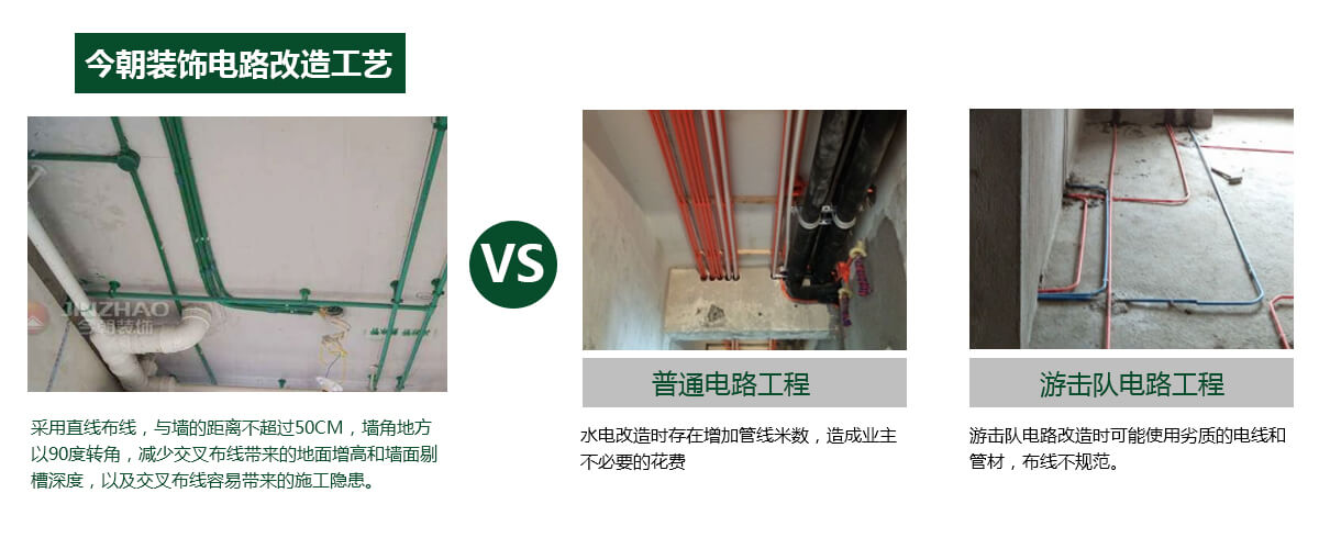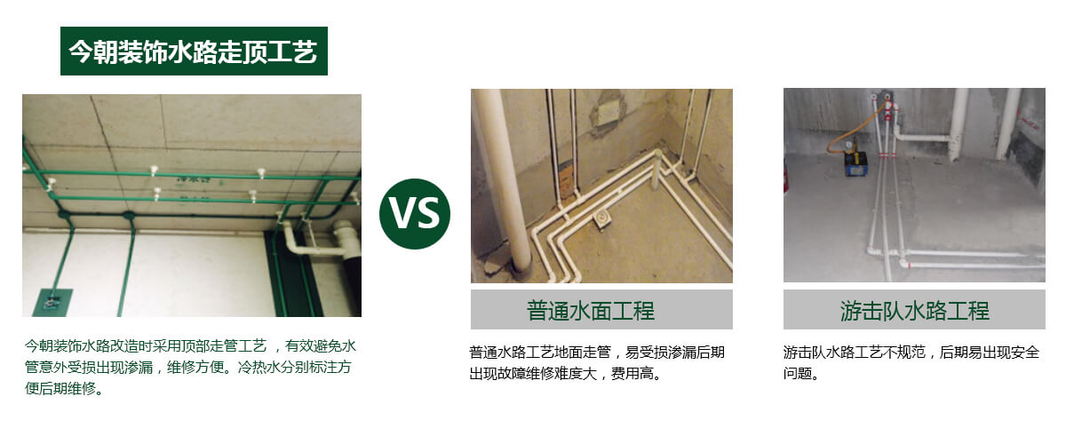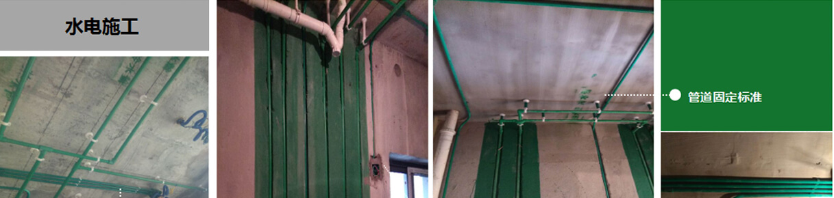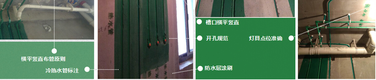 管路鋪設(shè)必須橫平豎直加吊卡,電管在水管之上,方便后續(xù)維修及墻面掛件、地面物件安裝。不破壞地面防水層。