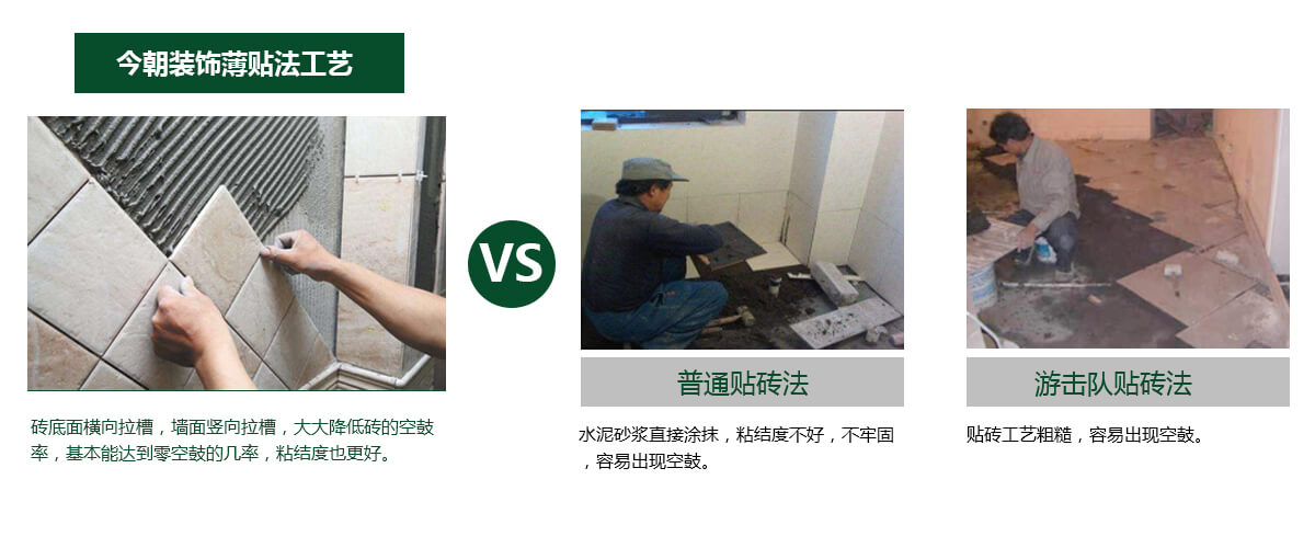 先將墻面拉毛、找平,使用東方雨虹專用瓷磚粘貼劑。瓷磚背面、墻表面涂抹3mm(墻面與瓷磚面分別進(jìn)行橫縱拉槽進(jìn)行鋪貼)。有效的防止瓷磚脫落及空鼓;與傳統(tǒng)鋪貼對(duì)比有效的增加房屋空間使用率。