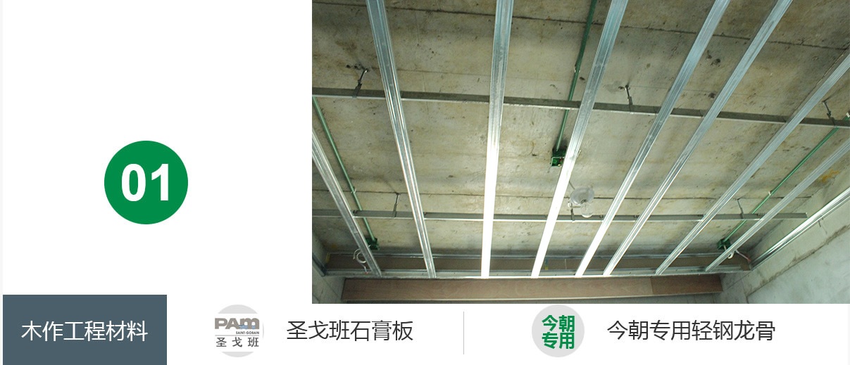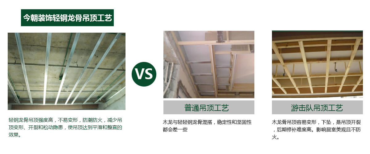 輕鋼龍骨吊頂,防火性高,不受季節(jié)變化影響變形開裂;吊頂造型簡(jiǎn)單大方,木工標(biāo)準(zhǔn)化施工。輕鋼龍骨間距40公分以內(nèi)間距固定。