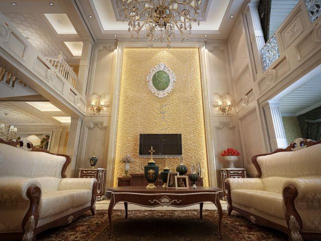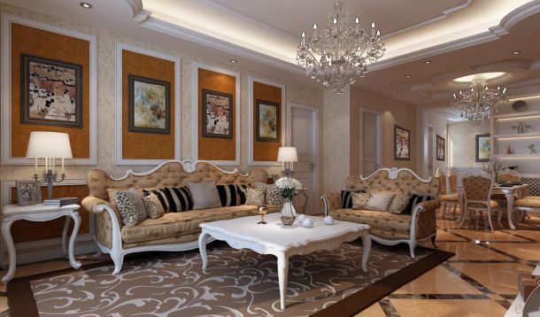 本案中采用美式風格設計,主要色調(diào):暗紅色、米黃色、金色,沙發(fā)組合配套整體扶墻板色調(diào),墻紙配合米黃色瓷磚,金黃色的吊燈與枕頭小碎花、實木茶幾融合在一塊,整體風格統(tǒng)一,融為一體。業(yè)主喜歡看美劇,喜歡美式住宅中獨具特色的羅馬柱,于是我們特意在電視背景墻處專門定制了兩個精美復古的石材羅馬柱,左右相對稱,再配以米黃色石材斜鋪墻面,給人眼前一亮的感覺。主臥,深咔色的床背軟包,銀色花紋的床被,實木護墻板及定制同色衣柜,古典蠟燭燈的吊燈,色彩少卻不單調(diào)。書房的吊頂用白色方格吊頂,精致的地板拼花,中間擺放著一張美式的書桌,配上真皮靠椅,徜徉于知識的海洋,流淌著濃厚的美式氣息。